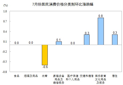 7月份,全國居民消費價格總水平環(huán)比上漲0.1%。其中,城市上漲0.1%,農(nóng)村持平(漲跌幅度為0,下同);食品價格持平,非食品價格上漲0.2%;消費品價格下降0.1%,服務(wù)價格上漲0.6%。
