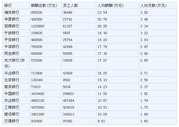 人均月薪超過3萬的共有五家,它們是浦發(fā)、華夏、招行、寧波及平安銀行,分別為3.92萬、3.46萬、3.34萬、3.22萬、3.03萬。