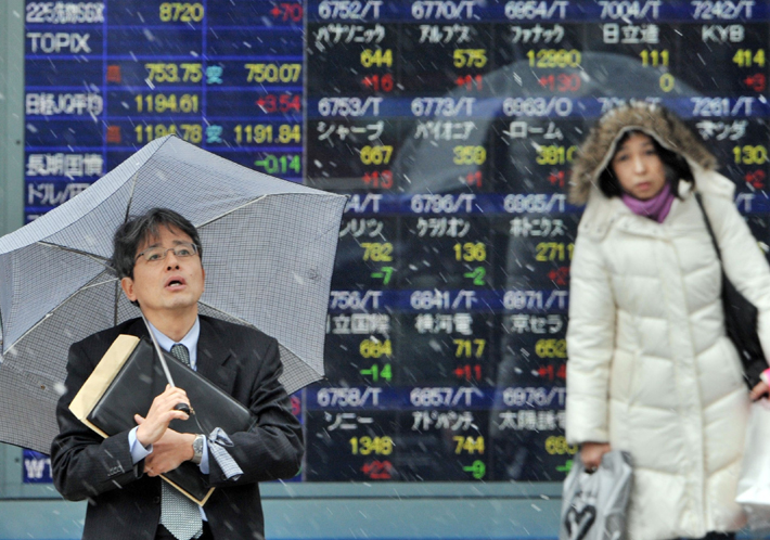 圖為日本首都東京街頭,人們走過股市信息顯示牌。新華/法新 |