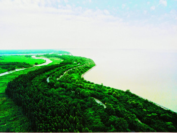 自明萬歷八年(公元1580年)起,洪澤湖大堤的迎水坡開始增筑直立式條石墻護(hù)面,時(shí)稱“石工墻”,歷經(jīng)明清兩代171年形成規(guī)模!笆Α庇们Ы镏氐臈l石及糯米石灰漿砌筑,共用條石6萬多塊,規(guī)格統(tǒng)一,筑工精細(xì),充分展示了我國古代水利建設(shè)的高超技藝。現(xiàn)如今,洪澤湖大堤已被納入江蘇省申報(bào)世界文化遺產(chǎn)的推薦名單之中。大堤兩側(cè)遍植樹木,宛如游移欲飛的巨龍依水而臥。人行其中,倍覺“浩渺云煙籠細(xì)浪,空蒙雨色入重淵”。