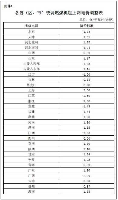 一、降低有關。▍^(qū)、市)燃煤發(fā)電企業(yè)脫硫標桿上網(wǎng)電價,具體降價標準見附件1。各地未執(zhí)行標桿電價的統(tǒng)調(diào)燃煤發(fā)電企業(yè)上網(wǎng)電價同步下調(diào)。