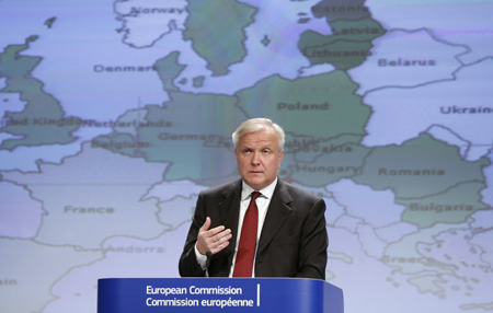 圖為歐盟委員會(huì)副主席兼經(jīng)濟(jì)與貨幣事務(wù)委員雷恩5日在布魯塞爾發(fā)布秋季經(jīng)濟(jì)預(yù)測(cè)。