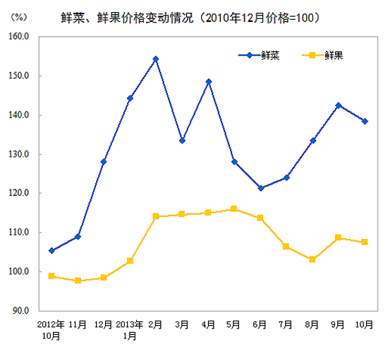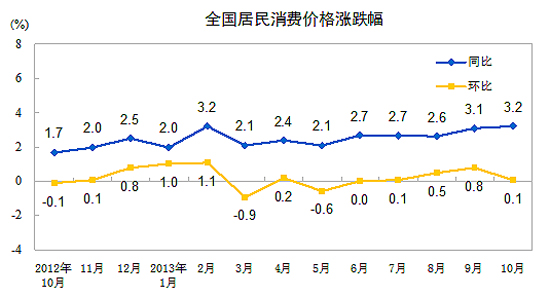 2013年10月份,全國(guó)居民消費(fèi)價(jià)格總水平同比上漲3.2%。其中,城市上漲3.2%,農(nóng)村上漲3.3%;食品價(jià)格上漲6.5%,非食品價(jià)格上漲1.6%;消費(fèi)品價(jià)格上漲3.2%,服務(wù)價(jià)格上漲3.1%。1-10月平均,全國(guó)居民消費(fèi)價(jià)格總水平比去年同期上漲2.6%。