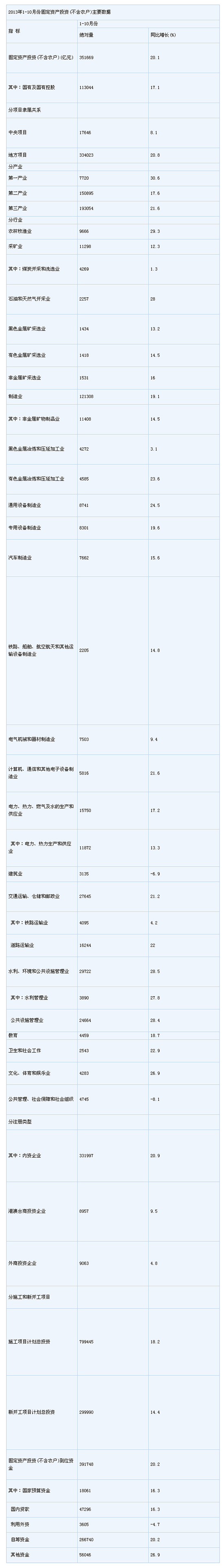 從施工和新開工項(xiàng)目情況看,1-10月份,施工項(xiàng)目計(jì)劃總投資799445億元,同比增長18.2%,增速比1-9月份回落0.4個(gè)百分點(diǎn);新開工項(xiàng)目計(jì)劃總投資299990億元,同比增長14.4%,增速加快1.1個(gè)百分點(diǎn)。
