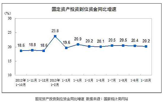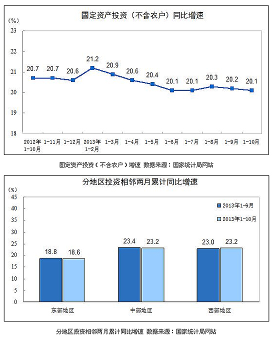 2013年1-10月份,全國固定資產(chǎn)投資(不含農(nóng)戶)351669億元,同比名義增長20.1%,增速比1-9月份回落0.1個(gè)百分點(diǎn)。從環(huán)比看,10月份固定資產(chǎn)投資(不含農(nóng)戶)增長1.43%。