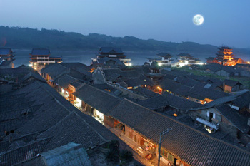 漫步在月光如洗、清涼寂靜的古鎮(zhèn)石板路上,皎潔的月光照著木板的門、屋檐的燈籠、淳樸的人,恍若歷經(jīng)千年的歷史。屋外澹澹的月光寂亮無(wú)垠,繾綣在這李莊舊夢(mèng)里,斑駁與繁華的光影輕舞流轉(zhuǎn)。