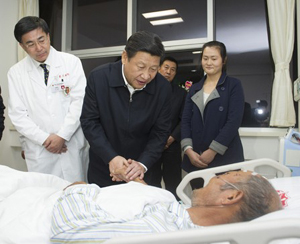 習(xí)近平在青島大學(xué)附屬醫(yī)院黃島分院看望慰問傷員 |