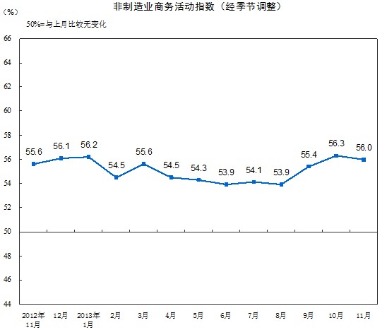 2013年11月,中國(guó)非制造業(yè)商務(wù)活動(dòng)指數(shù)為56.0%,比上月回落0.3個(gè)百分點(diǎn)。