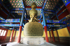 中國古代最精美的銅鑄毗盧佛 毗盧殿位于隆興寺中軸線最末端,殿內(nèi)的毗盧佛堪稱國寶,毗盧佛設(shè)計(jì)獨(dú)特,精美絕倫,為明萬歷皇帝朱翊鈞為其生母慈圣皇太后祝壽所御制的。這尊毗盧佛全部為青銅鑄造,高6.72米,由三層坐式毗盧佛和三層圓鼓形蓮座層置而成。三層蓮座的千葉蓮瓣上均鑄有一坐式小佛,表情、手印富于變化,整尊造像上共計(jì)大小佛像1072尊。這尊皇家御制的毗盧佛真實(shí)地反映了當(dāng)時(shí)的銅鑄工藝,據(jù)有極高的歷史、科學(xué)、藝術(shù)價(jià)值,堪稱海內(nèi)孤例。