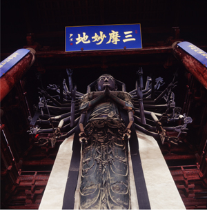 最高大、最古老的千手千眼觀音 大悲閣是隆興寺的主體建筑,閣內(nèi)供奉聞名遐邇的宋代銅鑄“千手千眼觀音菩薩”,俗稱“正定府大菩薩”。它為北宋開寶四年(971)奉太祖趙匡胤之命鑄造。像高21.3米,共42臂,除本身的兩只手、眼外,在身體左右各有20只手,分別執(zhí)日、月、凈瓶、金剛杵、寶劍等法器。銅像身軀高大,比例適度,其形體之巨、雕工之細(xì)實(shí)為罕見,是世界上古代銅鑄佛像中最高大、最古老的千手千眼觀世音菩薩像。