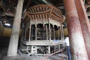 最古老的轉(zhuǎn)輪藏 轉(zhuǎn)輪藏直徑七米,是一座收藏經(jīng)文的旋轉(zhuǎn)書架,外觀形似八角形亭子,中設(shè)木軸,亭身設(shè)有經(jīng)屜,可以存放佛經(jīng),推之可轉(zhuǎn)動(dòng)。取佛教“法輪常轉(zhuǎn),自動(dòng)不息”之意,喻佛法猶如輪子輾轉(zhuǎn)相傳,永不停息。佛教中亦有推其旋轉(zhuǎn)與誦讀經(jīng)文同功之說。這種建筑形制國內(nèi)保存下來的甚少,主要有四川平武報(bào)恩寺華嚴(yán)店和北京智化寺藏殿的明代轉(zhuǎn)輪藏、北京頤和園萬壽山和山西五臺(tái)山塔院寺大藏經(jīng)閣清代轉(zhuǎn)輪藏、正定隆興寺轉(zhuǎn)輪藏閣內(nèi)的宋代轉(zhuǎn)輪藏,因此稱其是中國現(xiàn)存最早的轉(zhuǎn)輪藏。