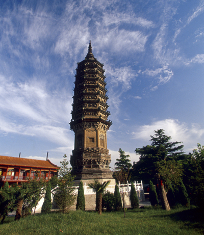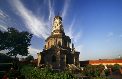 華塔原名多寶塔,始建于唐,高33.35米,矗立在廣惠寺內(nèi)。華塔由主塔和四小塔組成,主塔底層四隅各附建一座扁六邊形亭狀小塔,小塔環(huán)抱主塔,高低錯(cuò)落,主次相依,精巧華麗,壯觀秀逸。其奇特的平面布局是全國(guó)現(xiàn)存為數(shù)不多的其他花塔所不能比擬的,堪稱我國(guó)絕無(wú)僅有的稀世珍寶。