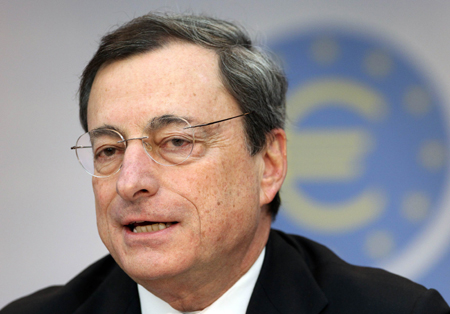 歐洲央行12月5日宣布將主要再融資利率維持在0.25%的歷史低點(diǎn)。歐洲央行還將明年的通脹預(yù)期由1.3%下調(diào)至1.1%,顯示出歐元區(qū)經(jīng)濟(jì)復(fù)蘇形勢(shì)依然脆弱;并將明年的經(jīng)濟(jì)增長(zhǎng)預(yù)期由1%上調(diào)至1.1%。歐洲央行行長(zhǎng)德拉吉表示,未來(lái)將繼續(xù)維持低利率政策,但未提出任何額外的寬松措施。圖為德拉吉當(dāng)天在新聞發(fā)布會(huì)上發(fā)言。