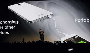 中國華為公司在2014拉斯韋加斯國際消費(fèi)電子展(CES)一場針對媒體的發(fā)布會上推出其2014款新型智能手機(jī)。記者 方喆