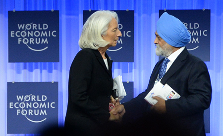 圖為1月25日,在達(dá)沃斯年會(huì)會(huì)議中心,拉加德(左)與印度計(jì)劃委員會(huì)副主席蒙特克·辛格·阿盧瓦利亞在出席關(guān)于全球經(jīng)濟(jì)展望的討論會(huì)時(shí)握手。