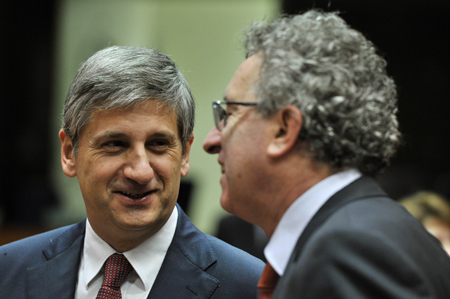 奧地利財長斯賓德萊格(左)28日與盧森堡財長格拉梅格納交談。當(dāng)日,歐盟經(jīng)濟(jì)與貨幣事務(wù)理事會(ECOFIN)在布魯塞爾舉行會議。據(jù)悉,本次會議將討論如何進(jìn)一步推進(jìn)單一監(jiān)管機(jī)制等一系列重要議題。單一監(jiān)管機(jī)制是歐盟建立銀行業(yè)聯(lián)盟的重要一步,歐洲央行將于今年11月正式承擔(dān)銀行業(yè)監(jiān)管職能。