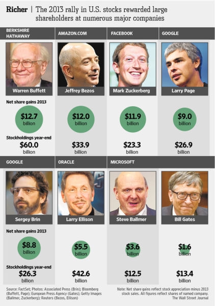 巴菲特、貝佐斯、扎克伯格等2013年因在各自公司的持股獲得了百億美元的賬面收益。