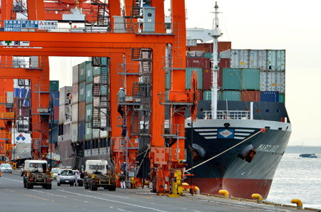 日本10日公布的數(shù)據(jù)顯示,受巨額貿(mào)易逆差拖累,2013年日本國際收支經(jīng)常項(xiàng)目順差額創(chuàng)歷史新低,為3.3061萬億日元,比前一年減少31.5%。數(shù)據(jù)還顯示,經(jīng)季節(jié)調(diào)整后,2013年12月日本國際收支經(jīng)常項(xiàng)目出現(xiàn)1967億日元逆差額,為連續(xù)4個(gè)月出現(xiàn)逆差。圖為10日在日本東京的一個(gè)貨運(yùn)碼頭,貨輪正在裝載貨物。