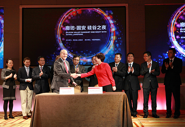 圖為廊坊﹒固安硅谷之夜,固安領導與舊金山灣區(qū)委員會主席簽署戰(zhàn)略合作協(xié)議