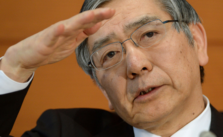 日本中央銀行(日本銀行)11日做出決定,維持現(xiàn)行超寬松貨幣政策不變,同時(shí)連續(xù)第六個(gè)月對(duì)該國經(jīng)濟(jì)做出“繼續(xù)溫和復(fù)蘇”的評(píng)估。盡管日本經(jīng)濟(jì)增速放緩,且上調(diào)消費(fèi)稅措施即將來臨,但日本央行依舊看好日本經(jīng)濟(jì)復(fù)蘇前景,認(rèn)為日本經(jīng)濟(jì)將逐漸擺脫通縮困局。圖為日本央行總裁黑田東彥在貨幣政策會(huì)議結(jié)束后出席新聞發(fā)布會(huì)。