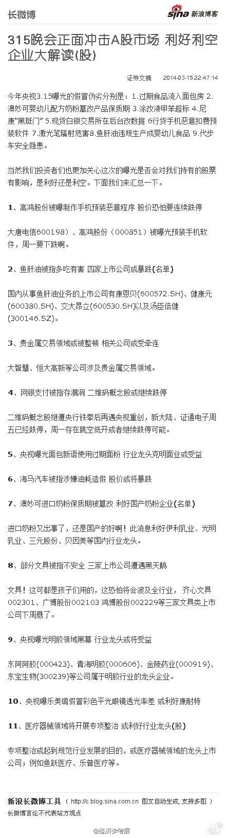 315晚會(huì)正面沖擊A股市場(chǎng) 利好利空企業(yè)大解讀