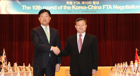 中韓自由貿(mào)易協(xié)定(FTA)第十輪談判17日至21日在韓國京畿道一山開幕,中國商務(wù)部部長助理王受文和韓國產(chǎn)業(yè)通商資源部審議官禹泰熙分別率中韓代表團出席會議。本輪談判將主要商討雙方開放市場的程度,中韓雙方將就貨物貿(mào)易、服務(wù)貿(mào)易、投資、原產(chǎn)地規(guī)則、貿(mào)易救濟、技術(shù)性貿(mào)易壁壘、衛(wèi)生和植物衛(wèi)生措施、知識產(chǎn)權(quán)等廣泛領(lǐng)域展開磋商。