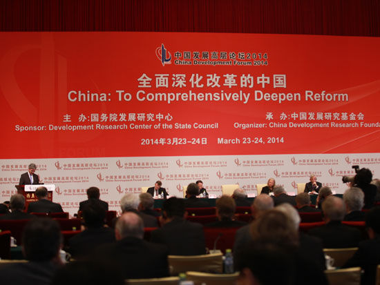 “中國(guó)發(fā)展高層論壇2014”于3月22日-24日在釣魚(yú)臺(tái)舉行。上圖為《對(duì)話會(huì)一:應(yīng)對(duì)過(guò)剩產(chǎn)能》論壇現(xiàn)場(chǎng)。
