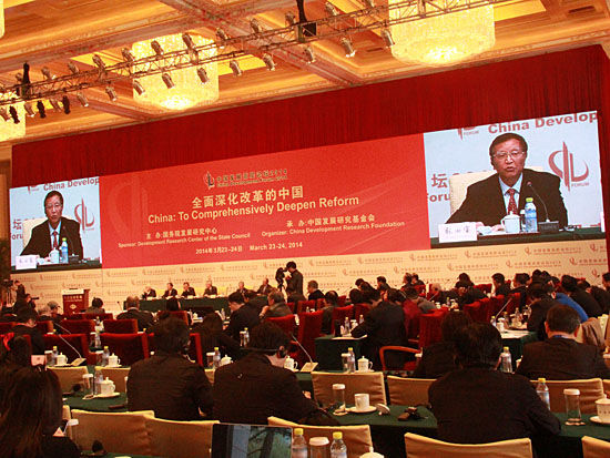 “中國發(fā)展高層論壇2014”于3月22日-24日在釣魚臺舉行。上圖為《對話會二:探索低碳發(fā)展之路》論壇現(xiàn)場。