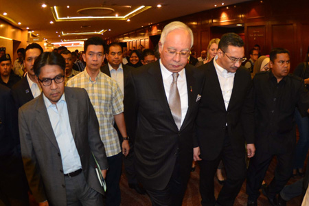 3月24日,馬來(lái)西亞總理納吉布宣布,新的數(shù)據(jù)顯示失聯(lián)的馬航MH370航班在澳大利亞城市珀斯西部的南印度洋海域墜毀。納吉布表示,根據(jù)新的分析結(jié)果,空難調(diào)查處和國(guó)際海事衛(wèi)星組織認(rèn)為MH370航班曾沿著南部走廊飛行,它的“最終位置”是在珀斯西部的印度洋。 圖為納吉布(中)離開發(fā)布會(huì)現(xiàn)場(chǎng)。