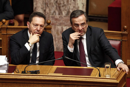 歐元集團(tuán)財(cái)政部長(zhǎng)非正式會(huì)議4月1日將在雅典舉行,向希臘發(fā)放救助貸款將是議題之一。希臘議會(huì)當(dāng)天通過(guò)的改革法案,或?qū)闅W元集團(tuán)財(cái)政部長(zhǎng)發(fā)放下一筆救助貸款掃清道路。投票結(jié)束后,希臘總理、新民主黨領(lǐng)導(dǎo)人薩馬拉斯將該黨一名投反對(duì)票的議員開(kāi)除,這使由新民主黨和泛希臘社會(huì)主義運(yùn)動(dòng)組成的兩黨聯(lián)合政府在議會(huì)只擁有兩席的微弱多數(shù)。圖為希臘總理薩馬拉斯(右)和財(cái)政部長(zhǎng)斯圖納拉斯(左)在議會(huì)中等待議員們進(jìn)行投票。