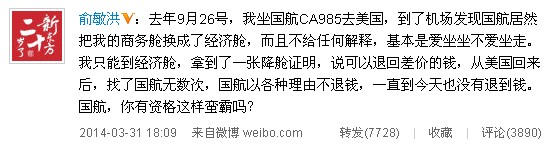 新東方董事長(zhǎng)俞敏洪今日在微博上投訴,國(guó)航把其商務(wù)艙換成了經(jīng)濟(jì)艙,而且不給任何解釋,找了國(guó)航無(wú)數(shù)次,國(guó)航以各種理由不退錢。以下為其微博全文: