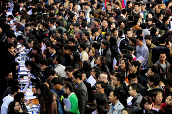 東北大學(xué)2014屆畢業(yè)生春季就業(yè)雙向選擇洽談會上人頭攢動!⌒氯A社發(fā)(張文魁/攝) |