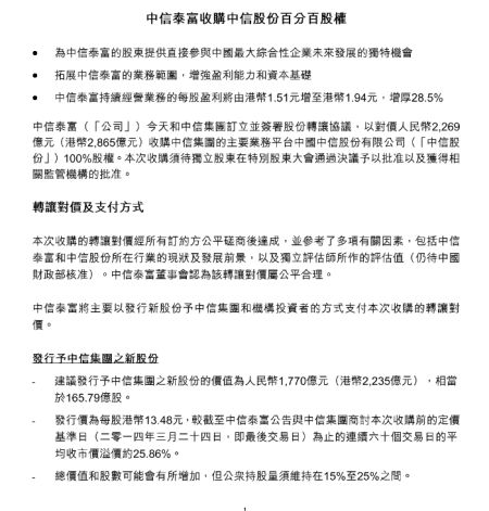 中信泰富公布收購中信股份方案,圖為中信泰富新聞稿截圖。(圖片來源:中信泰富官方網(wǎng)站)