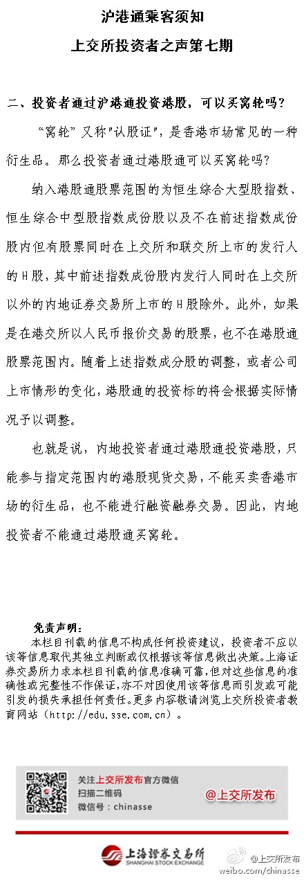 針對“投資者通過滬港通投資港股,可以買窩輪嗎?”的問題,上交所今日在微博上回應(yīng):內(nèi)地投資者不能通過港股通買“窩輪”。
