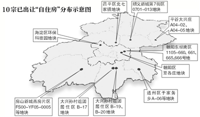 北京已經(jīng)有9個(gè)自住房項(xiàng)目啟動(dòng)申請(qǐng),可提供自住房約15000套。北京在2014年全年供應(yīng)的自住房量將突破4萬(wàn)套。圖為10宗已出讓“自住房”分布示意圖。