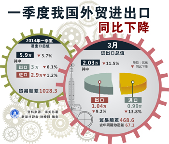 此前海關(guān)總署發(fā)布的一季度數(shù)據(jù)顯示,2014年一季度,中國(guó)進(jìn)出口總額9659億美元,同比下降1%。其中,出口下降3.4%,進(jìn)口增長(zhǎng)1.6%;貿(mào)易順差下降59.8%。