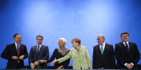 圖為當(dāng)日世界銀行行長(zhǎng)金墉、世界貿(mào)易組織總干事羅伯托·阿澤維多、國(guó)際貨幣基金組織總裁克里斯蒂娜·拉加德、德國(guó)總理默克爾、經(jīng)合組織秘書(shū)長(zhǎng)安赫爾·古里亞和國(guó)際勞工組織總干事蓋伊·賴(lài)德(從左至右)出席新聞發(fā)布會(huì)!