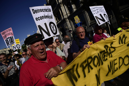 西班牙部分民眾17日繼續(xù)舉行游行,作為紀(jì)念“5月15日憤怒者”運(yùn)動發(fā)起三周年活動的一部分。該運(yùn)動旨在通過游行對政府實(shí)行財政緊縮政策以及未能重振疲弱的經(jīng)濟(jì)表示抗議。 圖為抗議者在首都馬德里舉行游行活動!