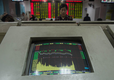 5月19日,滬深股市雙雙下跌,跌幅超過1%。上證綜指盤中一度失守2000點,最終以2005.18點報收,較前一交易日跌1.05%;深成指收于7151.49點,較前一交易日跌1.25%。 圖為股民在杭州一家證券營業(yè)所內(nèi)關(guān)注股市行情。