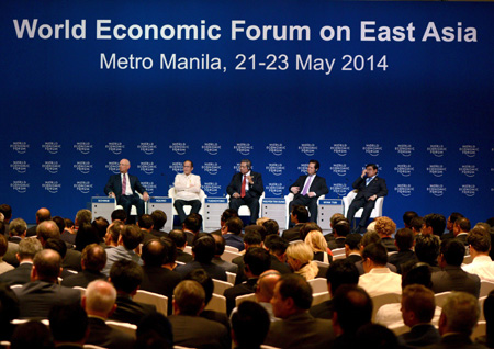 圖為世界經(jīng)濟(jì)論壇主席克勞斯·施瓦布、菲律賓總統(tǒng)阿基諾、印尼總統(tǒng)蘇西洛·班邦·尤多約諾、越南總理阮晉勇和緬甸副總統(tǒng)吳年吞參加22日的峰會(huì)(從左至右)。