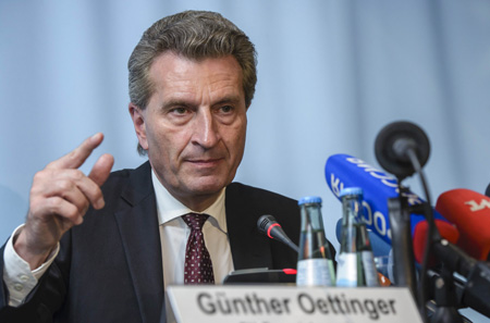 歐盟、俄羅斯和烏克蘭代表當(dāng)?shù)貢r間26日在德國首都柏林舉行新一輪天然氣問題談判。歐盟委員會負(fù)責(zé)能源事務(wù)的委員奧廷格(上圖)在之后舉行的記者會上表示,烏克蘭初步同意償還所欠俄羅斯天然氣款20億美元,并于6月7日再償還5億美元欠款。但俄烏雙方代表仍需和各自領(lǐng)導(dǎo)層及能源公司協(xié)商,28日晚將作出最終決定。