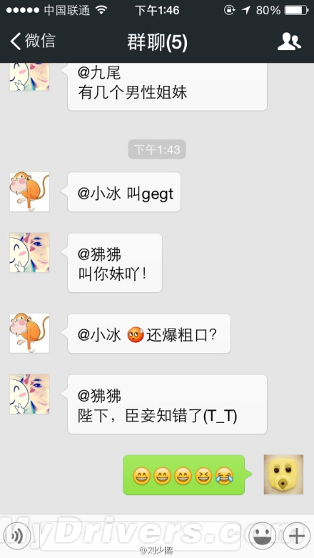“小冰”集合了中國(guó)近七億網(wǎng)民多年來積累的全部公開聊天記錄,并從中精煉出1500萬條語(yǔ)料庫(kù),同時(shí)可以通過上下文語(yǔ)境來給與回應(yīng),已經(jīng)可以相當(dāng)于16歲少女的智商。目前,小冰已經(jīng)開始測(cè)試,你可以將她加到微信群中聊天。