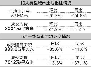 摘要:5月份一線城市土地成交建筑面積創(chuàng)近兩年來新低,二線典型城市土地成交同比也是量價(jià)齊跌。預(yù)計(jì)今年上半年,10大典型城市土地出讓金收入同比仍將保持大幅增長。