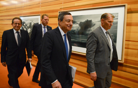 歐洲央行5日的貨幣政策會議決定,下調三大政策利率:將歐元區(qū)基準利率下調10個基點至0.15%,隔夜存款利率由零下調至-0.1%,隔夜貸款利率下調35個基點至0.4%。歐洲央行行長德拉吉隨后還明確表示,將再次啟動定向長期再融資操作,并為啟動歐版QE做準備。這一消息推動歐洲股市全線走強,歐元對美元匯率迅速下跌。德國DAX指數盤中首次突破1萬點。 圖為德拉吉(前左)前往會后的新聞發(fā)布會。