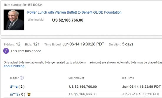 2013年巴菲特午餐拍出100萬(wàn)零100美元,是2008年以來(lái)7屆拍賣的罕見“低價(jià)”。2008年中標(biāo)價(jià)從2007年的65.01萬(wàn)美元飆升至211.01萬(wàn)美元,至今7屆中有5屆的價(jià)格都超200萬(wàn)美元,其中2012年更創(chuàng)下345.679萬(wàn)美元的天價(jià)紀(jì)錄,除了2013年的“低價(jià)”外,只有2009年的中標(biāo)價(jià)不到200萬(wàn)美元,但也達(dá)到了近170萬(wàn)美元的水平。