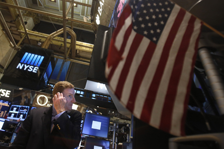 受外圍市場上漲提振,紐約股市三大股指9日上漲,其中道瓊斯工業(yè)平均指數(shù)和標(biāo)普500指數(shù)再創(chuàng)新高。截至當(dāng)天收盤,道瓊斯工業(yè)平均指數(shù)比前一個交易日漲18.82點,收于16943.10點,漲幅為0.11%。標(biāo)準(zhǔn)普爾500種股票指數(shù)漲1.83點,收于1951.27點,漲幅為0.09%。圖為一名交易員9日在美國紐約證券交易所內(nèi)工作。