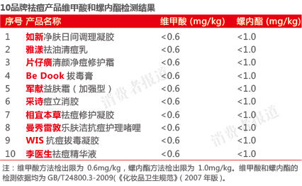 本刊此次就選擇了維甲酸和螺內(nèi)酯進(jìn)行檢測。據(jù)檢測結(jié)果顯示,10款產(chǎn)品兩物質(zhì)含量均低于檢出限0.6mg/kg和1.0mg/kg。