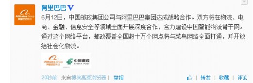 6月12日,中國郵政集團(tuán)公司與阿里巴巴集團(tuán)達(dá)成戰(zhàn)略合作。雙方將在物流、電商、金融、信息安全等領(lǐng)域全面開展深度合作,合力建設(shè)中國智能物流骨干網(wǎng)。通過這個網(wǎng)絡(luò)平臺,郵政覆蓋全國超十萬個網(wǎng)點(diǎn)將與菜鳥網(wǎng)絡(luò)全面打通,并開放給社會化物流。