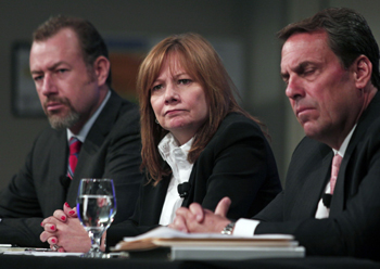 通用汽車首席執(zhí)行官芭拉(中)在公布關(guān)于因點(diǎn)火開關(guān)故障召回事件調(diào)查報告的發(fā)布會上!≠Y料照片 |
