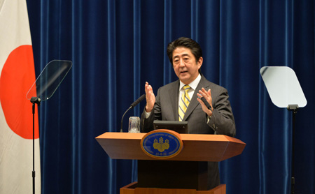 6月24日,在日本東京,日本首相安倍晉三在新聞發(fā)布會上講話。